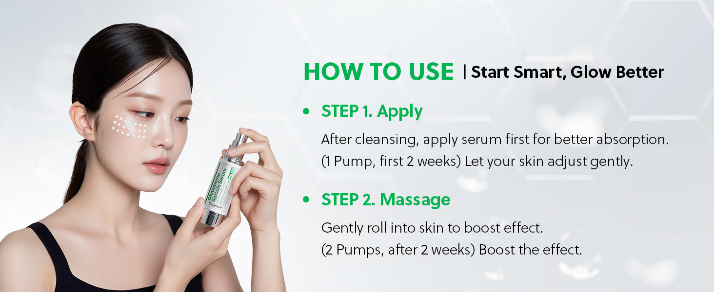 Apply an appropriate amount onto your freshly cleansed face. Gently roll and spread across your skin, avoiding the eye and lip areas. Lightly press with your palms for better absorption. A tingling or warming sensation is natural. Start with a small amount if needed and increase as tolerated.