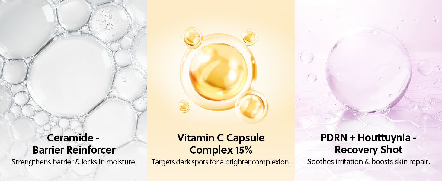 This essential serum targets dullness, uneven tone, and weakened skin barriers by combining 15% Vitamin C Capsule Complex, Ceramide NP, and PDRN in a fast-absorbing, skin-conditioning formula.
